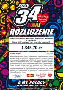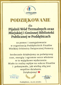 Składamy serdeczne podziękowania dla Czytelników Miejskiej i Gminnej Biblioteki Publicznej im. Ziemowita Skibińskiego w Poddębicach oraz osób odwiedzających Pijalnię Wód Termalnych w Poddębicach za okazałe serce i pomoc, czyli wspólne granie podczas 34. Finału WOŚP.