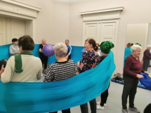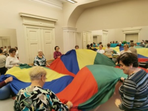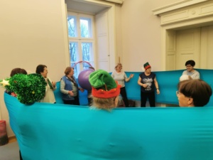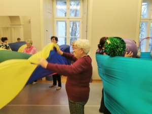 🎨 Seniorzy ćwiczyli małą i dużą motorykę z użyciem chusty animacyjnej, rozwijając koordynację, refleks i płynność ruchu.